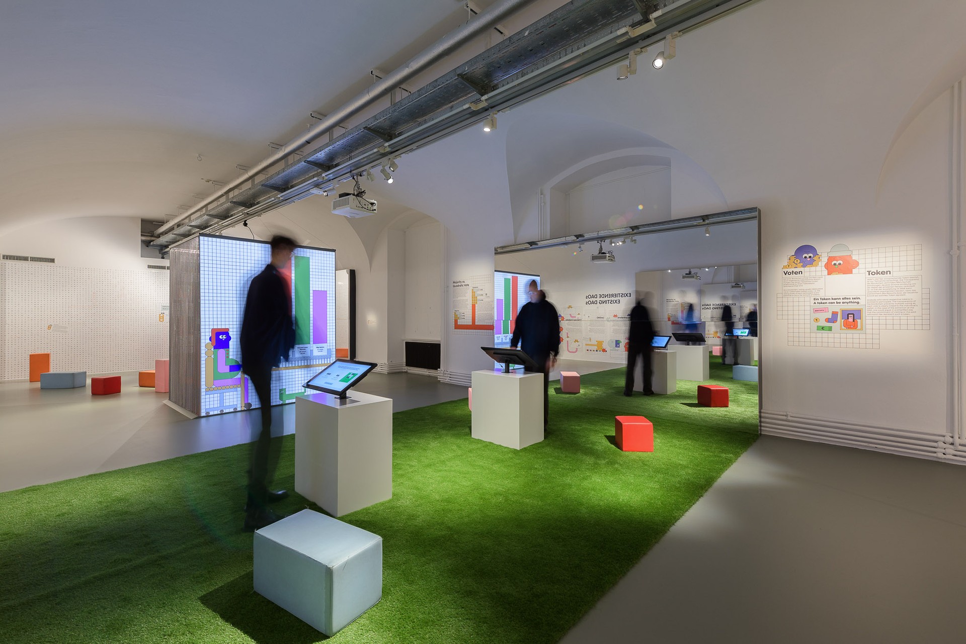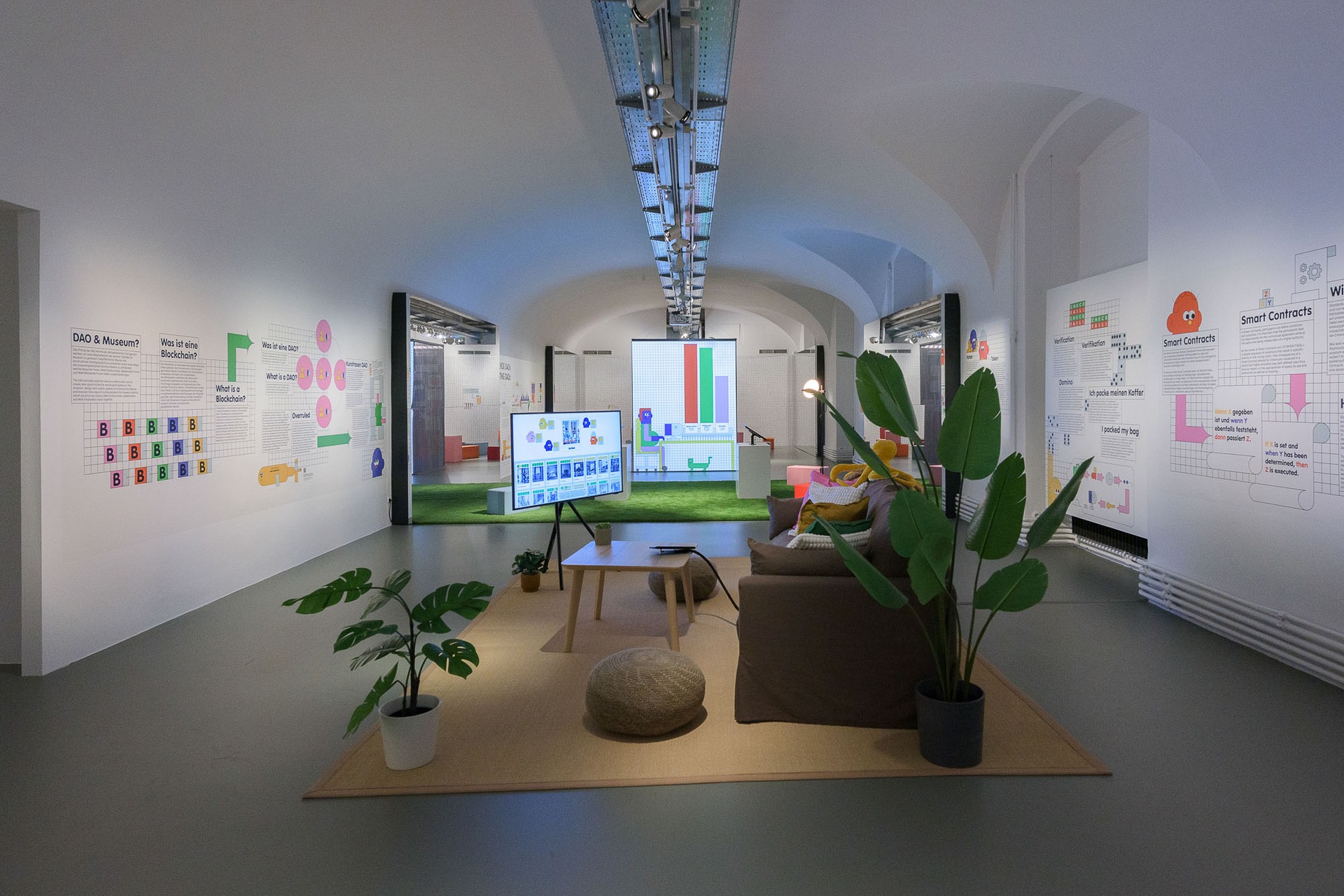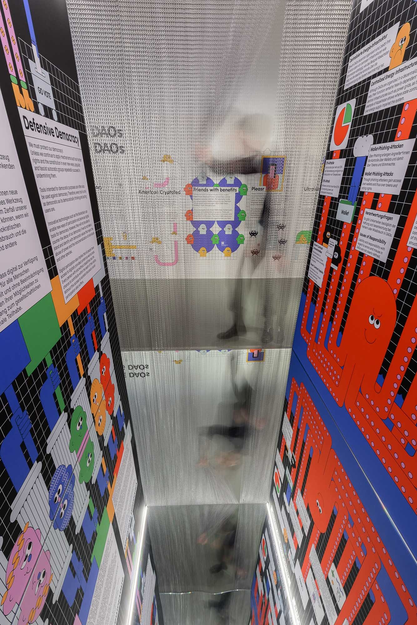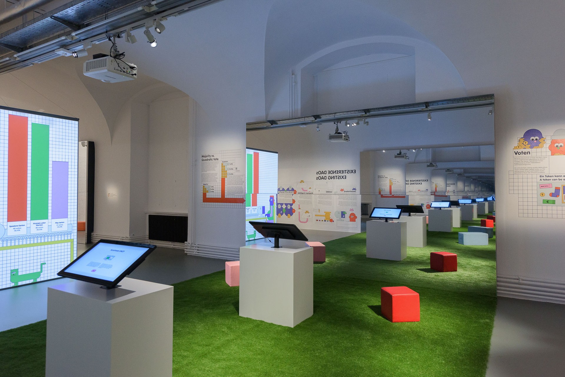 In this living room space, guests engage as part of a shared home, offering input while learning about Smart Contracts. In the MAK Garden, visitors actively participate in DAO voting mechanisms by choosing which real events to hold at the MAK Garden (MAK Kunstrasen), bringing the concept of voting to life. Both this area and the concluding section feature infinity mirrors that visually symbolise the blockchain, immersing guests in its endless possibilities. The Critic Room challenges perceptions by altering mirror axes to create a surreal, bottomless, and topless effect, highlighting the limitations and challenges these technologies pose. Featuring Ettore Sottsass building blocks, the last area invites visitors to construct and foster discussions. A large word search wall introduces various terms related to DAOs, stimulating dialogue and exploration of their connections.