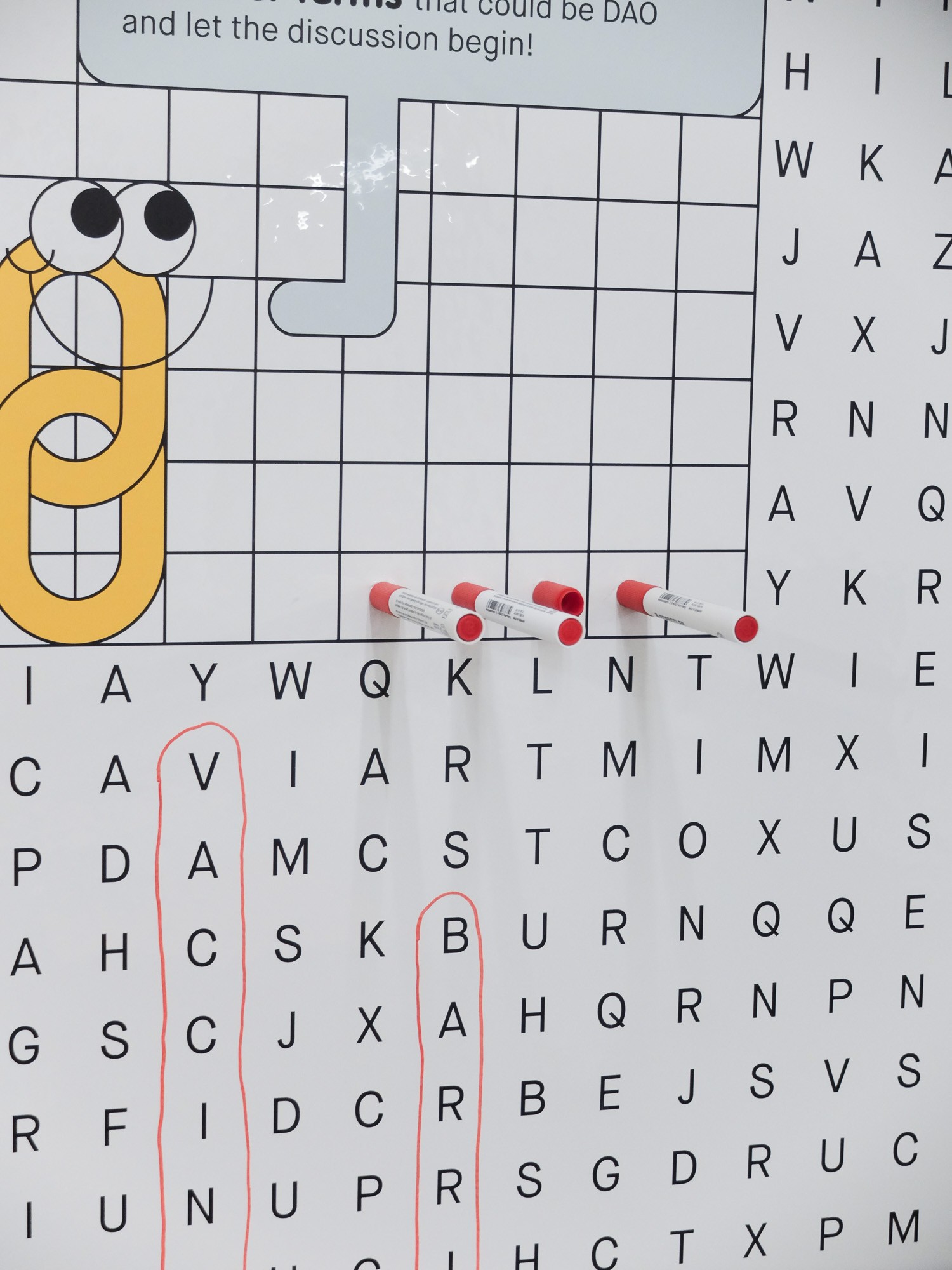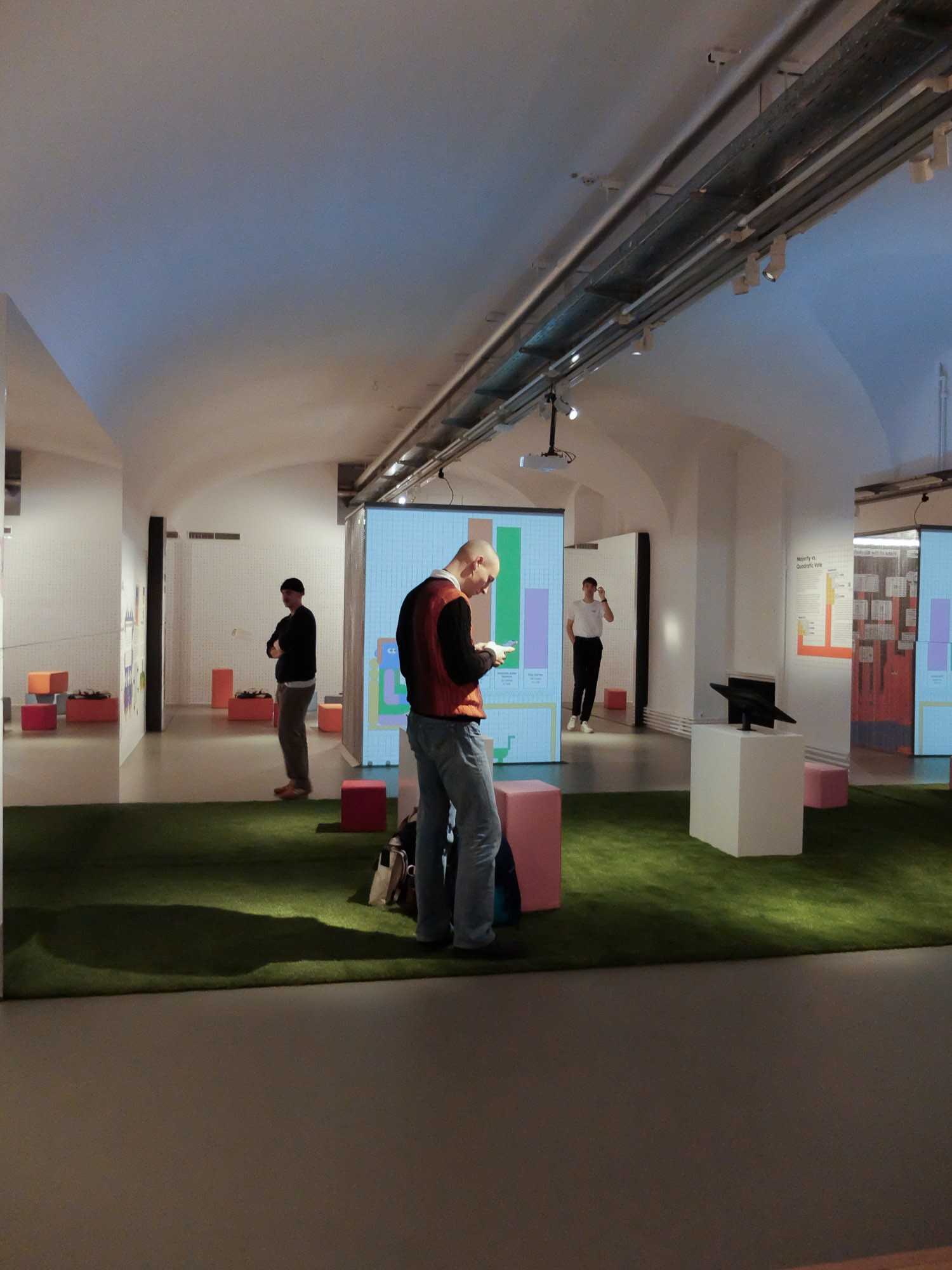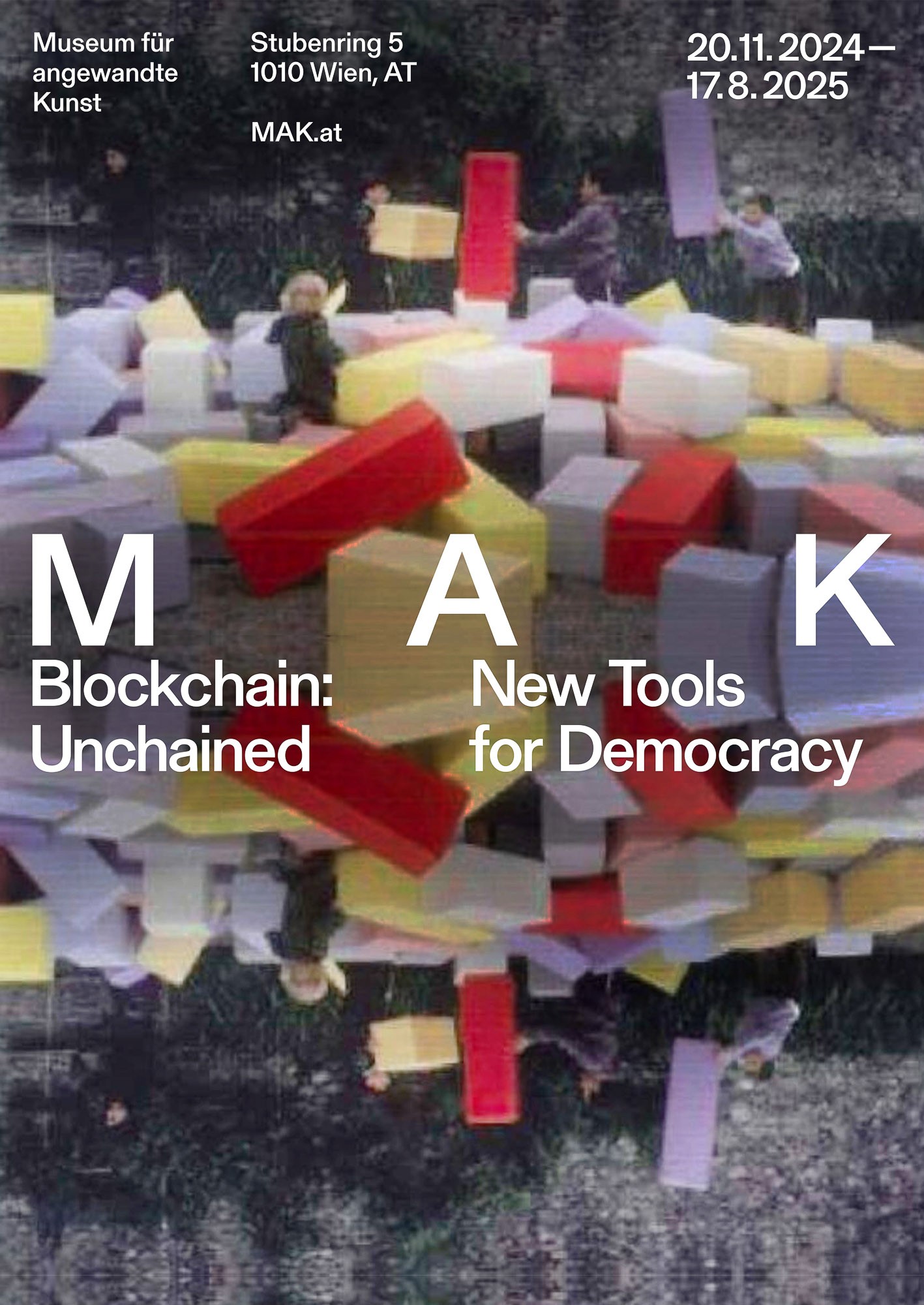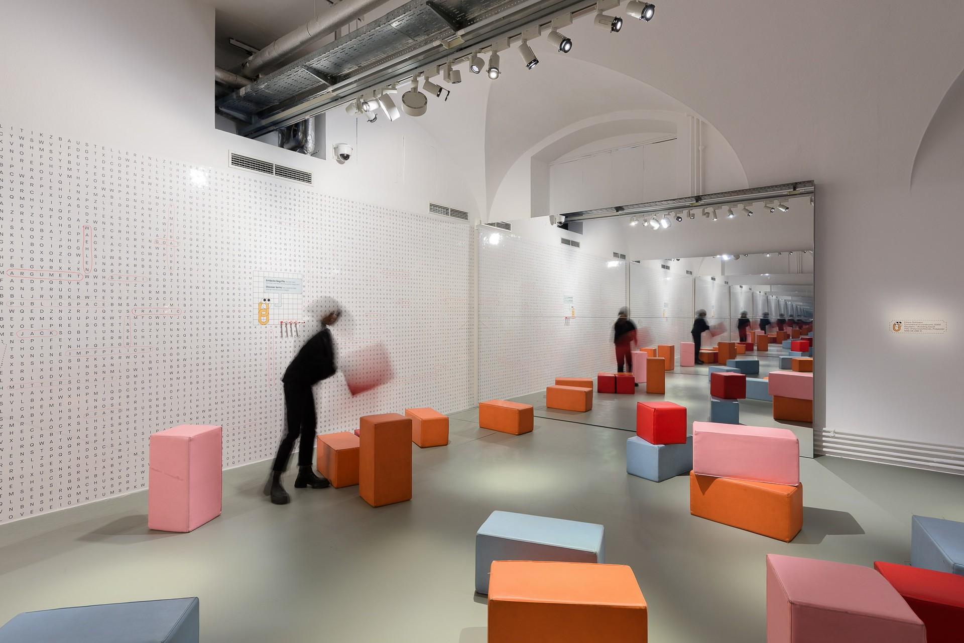 In this living room space, guests engage as part of a shared home, offering input while learning about Smart Contracts. In the MAK Garden, visitors actively participate in DAO voting mechanisms by choosing which real events to hold at the MAK Garden (MAK Kunstrasen), bringing the concept of voting to life. Both this area and the concluding section feature infinity mirrors that visually symbolise the blockchain, immersing guests in its endless possibilities. The Critic Room challenges perceptions by altering mirror axes to create a surreal, bottomless, and topless effect, highlighting the limitations and challenges these technologies pose. Featuring Ettore Sottsass building blocks, the last area invites visitors to construct and foster discussions. A large word search wall introduces various terms related to DAOs, stimulating dialogue and exploration of their connections.