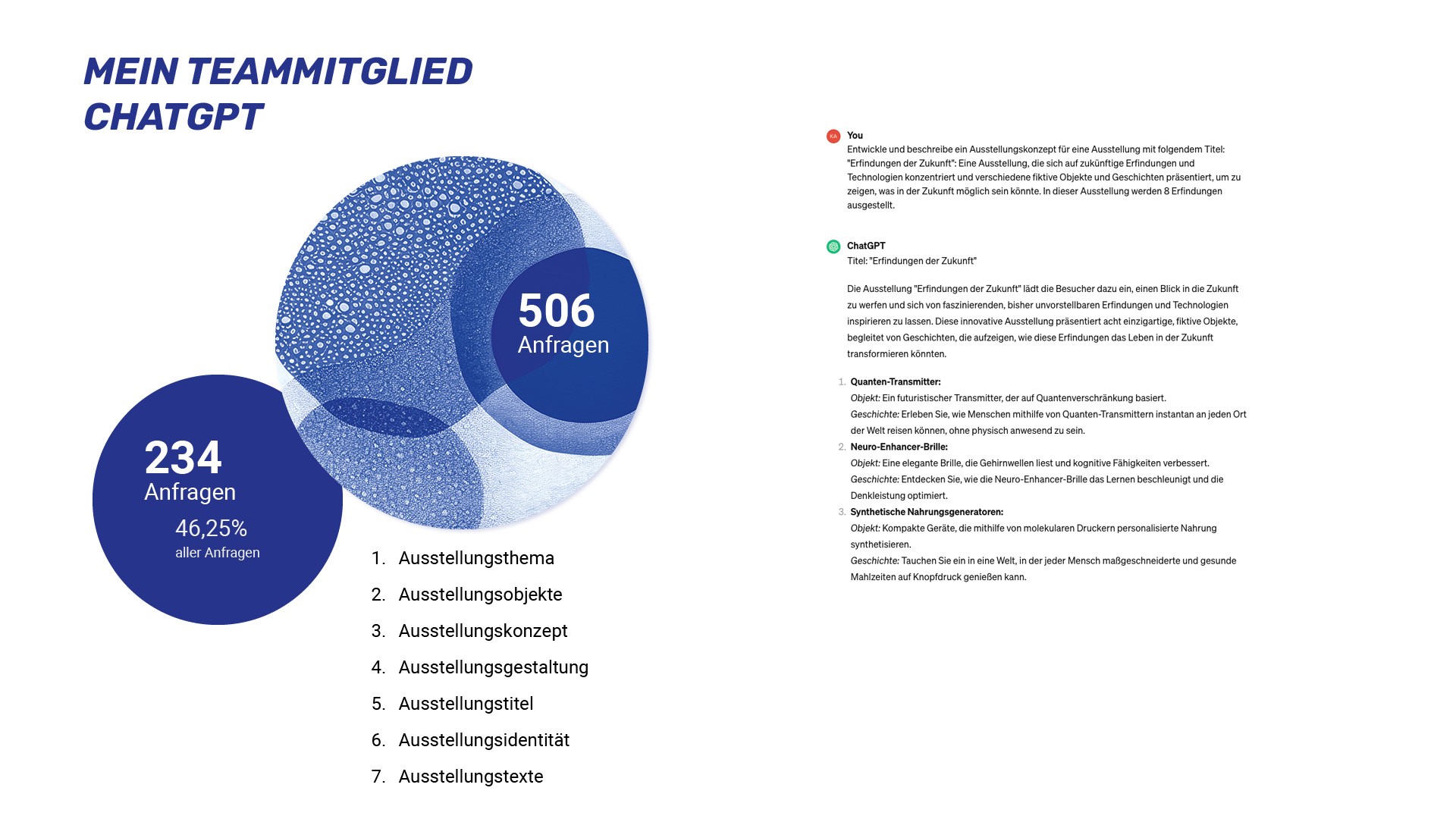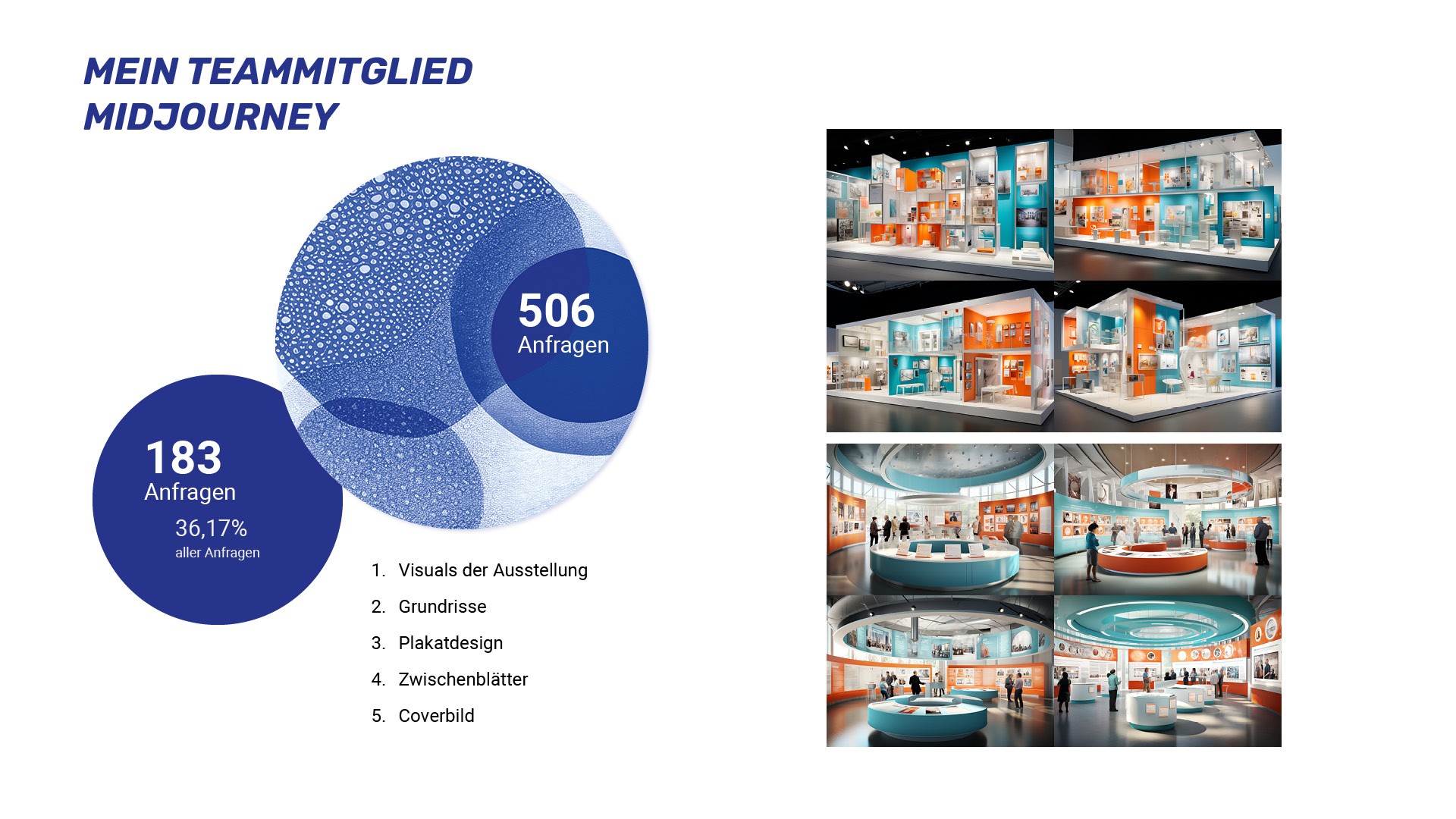 How does the integration of AI affect exhibition design? To what extent does AI influence the work of designers? To answer these questions, interviews with practising designers were carried out in addition to literature research. The literature research, interviews and the experiences working with AI have shown that AI is primarily a tool that designers can use in their work processes. AI does not play a decisive role here, but a supporting one. The use of AI can accelerate project development, especially for the first steps of a project, such as brainstorming. It is the task of museums and educational institutions to introduce and explain new technologies such as AI to people. In this way fears and inhibitions can be taken away to work with tools such as AI. Until AI becomes part of design education, designers will have to try it out for themselves and determine how AI can support them in their work processes.